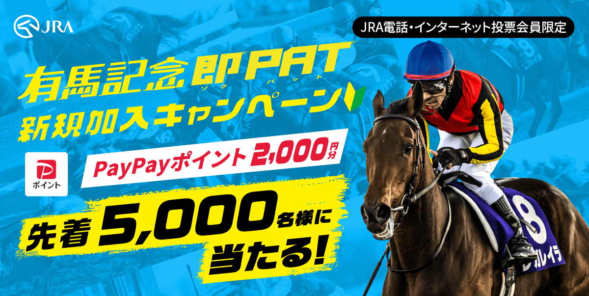 競馬を始めるなら今がおトク!有馬記念即PAT新規加入キャンペーン!即PATに新規でご加入&馬券購入で“先着”5,000名様にPayPayポイント2,000円分をプレゼント!