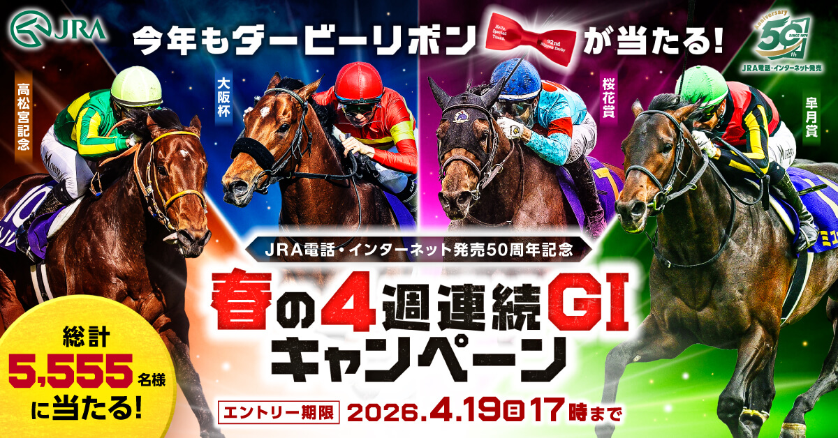 /JRA電話・インターネット発売50周年記念春の4週連続GIキャンペーンエントリー受付中!\2026年はJRA電話・ネット発売50周年!対象レースの馬券を購入すると豪華賞品が5,555名様に当たる!エントリーは4月19日(日)17:00まで...